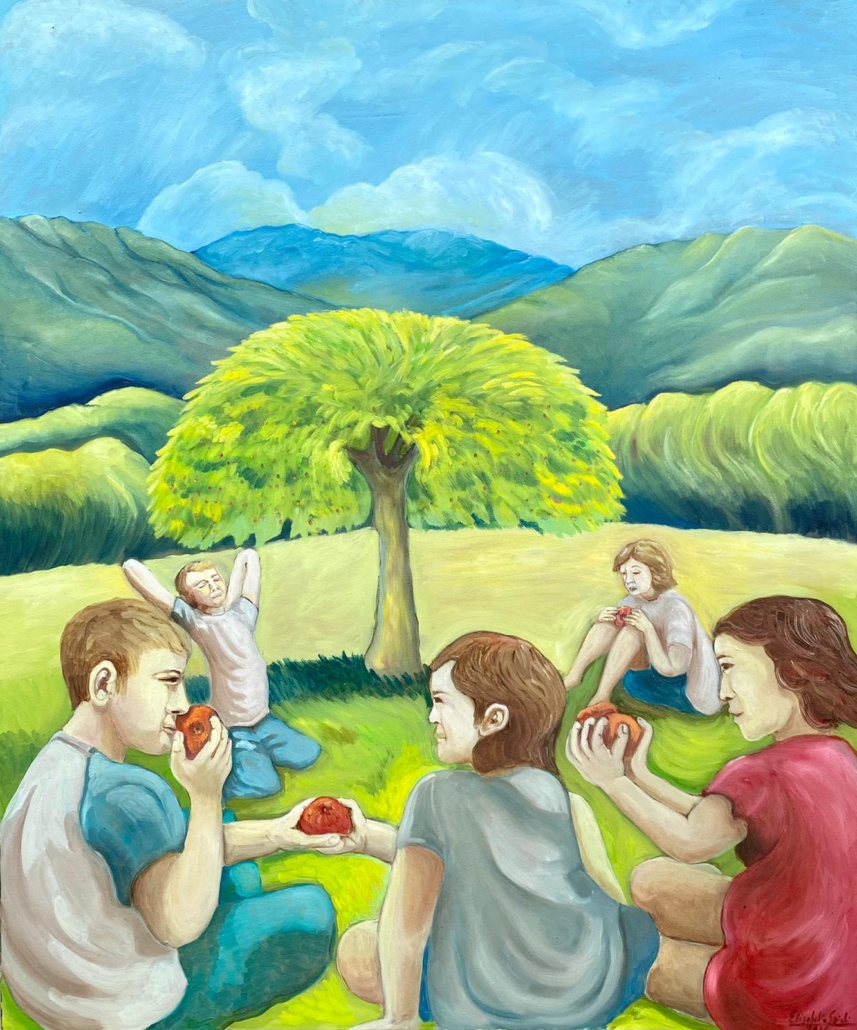 Da questa mancanza di conoscenza di sé e di ciò che lo circonda, nasce lʼidea della Natura come qualcosa di selvaggio, ma la natura è natura. Ed è attraverso la condivisione di un dono della natura da parte dei bambini, esseri puri, che nasce la consapevolezza del nostro sé selvaggio e di una natura benevola con chi la sa ascoltare. In un possibile sviluppo e crescita dellʼumano, non vi è altro che il ritorno allʼessenza antropologica primordiale dellʼessere natura. Lʼalbero rappresentato nellʼopera è un albero domestico, contornato da montagne a tratti selvagge, ma allo stesso tempo benevole, inquiete e gentili.