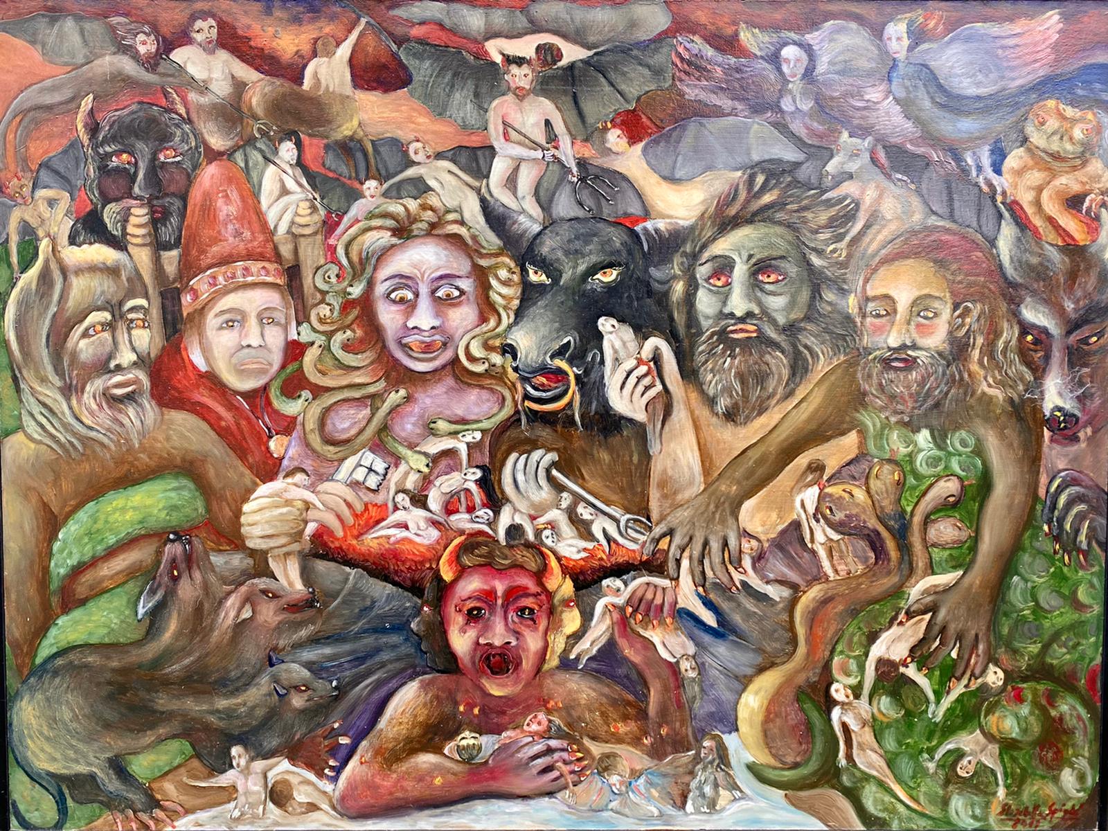 Una sfilata di maschere, un affollarsi di demoni giunti in Malebolge da ogni girone infernale per una grande festa di carnevale, per un immenso banchetto di carne d’anime. Nessuno può mancare, da Minosse a Pluto, da Caronte a Gerione al Minotauro, da Cerbero a Malacoda e al suo seguito di diavoli sadici, furbi e sguaiati; dalle Arpie alla Medusa ai Centauri e, naturalmente, a Lucifero… Anche Bonifacio VIII partecipa al gioco, lui che ha trascinato le anime fuori dalla via del bene, lui che ha perseguitato gli innocenti per la sua ebbrezza di potere, facendo “strazio” della Chiesa dopo averla sposata con l’inganno. Una turba di demoni che ghermiscono con i loro artigli e i loro raffi il nostro tempo, le nostre speranze, i nostri sogni, la nostra vita. Fuori di noi, nei giochi violenti e fraudolenti del potere, nella cieca avidità di poltrone e troni, nell’incontenibile bramosia dell’avere. Dentro di noi, nel gelo di ogni nodo non sciolto, nelle aride rovine di ogni odio non trasformato in amore, nella pietrificazione dell’io in uno ieri ormai morto. Siamo ancora in Malebolge e nulla è cambiato… Nulla può cambiare finché non troviamo il coraggio di sottrarci all’eterno carnevale di maschere vuote e di ghigni atroci per aprire gli occhi al nostro cielo e “riveder le stelle”. La novità, nella mia interpretazione dell’Inferno, è che mancano i gironi danteschi: i demoni sono tutti in un unico “luogo”, stipati nell’incubo di tenebra dell’inconscio.